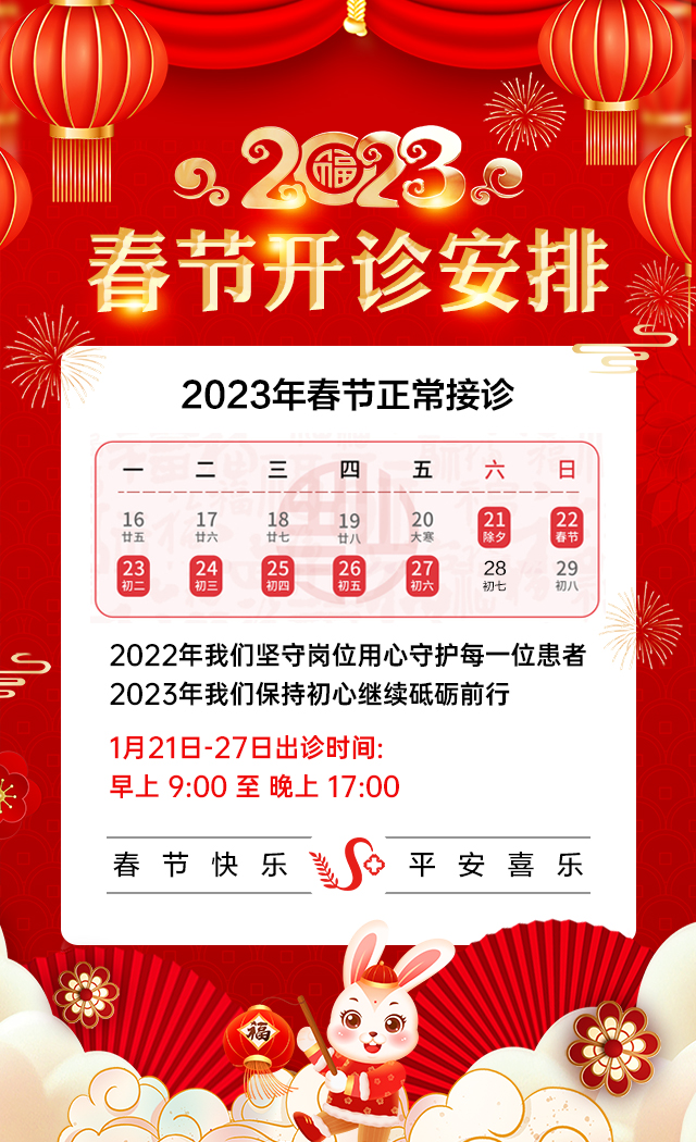 新年的鐘聲即將敲響,歷史又將翻開新的一頁,在這辭舊迎新之際,陜西省老醫協生殖醫學醫院向關心支持了我們一年工作的各級領導及朋友們,致以美好的祝愿和親切的問候!愿健康在新的一年里入住每一個家庭!為慶賀2023年新年的開始,為了確保男性身體健康,陜西省老醫協生殖醫學醫院春節期間專家照常坐診,為您的健康不打烊。